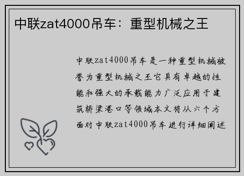 本文将以中联吊车35h为中心,从性能特点、应用领域、安全性能、节能环保、维护保养和市场前景等六个方面进行详细阐述,全面介绍中联吊车35h的优势和特点。