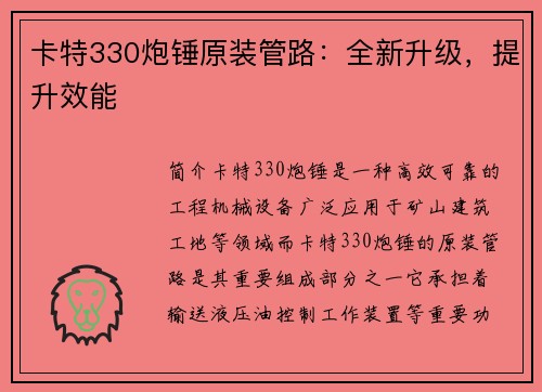 卡特330炮锤原装管路是炮锤正常工作的关键组成部分,具有重要的作用。通过对管路结构、材质、作用、维护和注意事项的介绍,相信读者对卡特330炮锤原装管路有了更深入的了解。在使用和维护过程中,要注意管路的连接牢固、工作温度和压力的控制,以及定期的维护保养,这样才能保证炮锤的正常工作和延长其使用寿命。